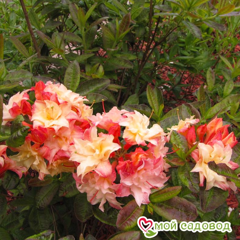 Листопадная азалия с оригинальной игрой красок! Цветки махровые (9-12 волнистых лепестков), с переливчатыми оттенками — светло-жёлтыми, кремово-жёлтыми, розово-жёлтыми и отчасти красновато-жёлтыми. Соцветия высотой 6 см, шириной 9 см, состоят из 5-7 цветков диаметром 5 см. Цветение позднее, с середины июня. Куст вертикальный и широкий, к 10-ти годам высота и ширина 180 см.